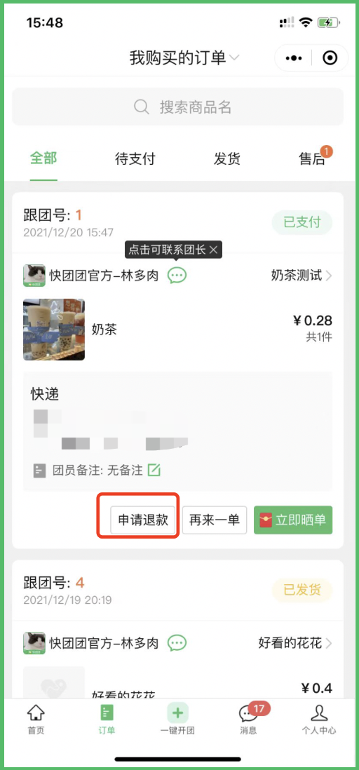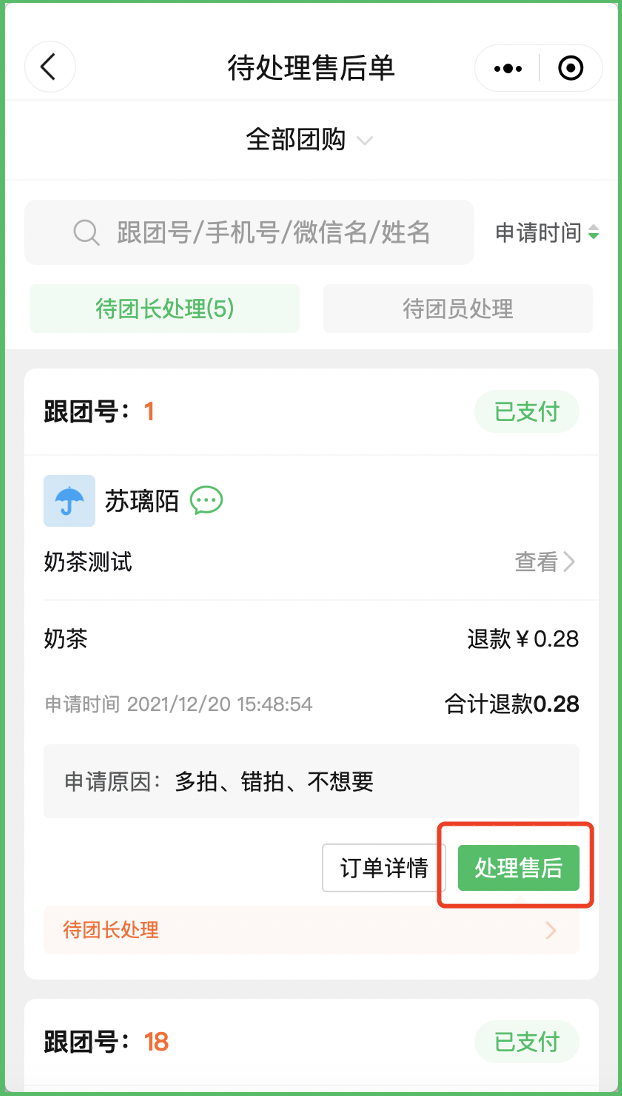 当团员发起退款后,供货团长可以在“订单”——“我售出的订单”——“售后”——“售后单”中,处理团员的售后单